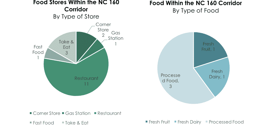 Below are three areas in Charlotte considered a food desert by the Charlotte Food Policy. The corresponding pie charts reveal the lack of full-scale food stores that sell fresh fruits, vegetables, dairy, and other staples of a healthy diet. The graphs show the types of stores available to residents in these areas, most commonly gas stations, fast food, corner stores, and restaurants. Please click to enlarge images.